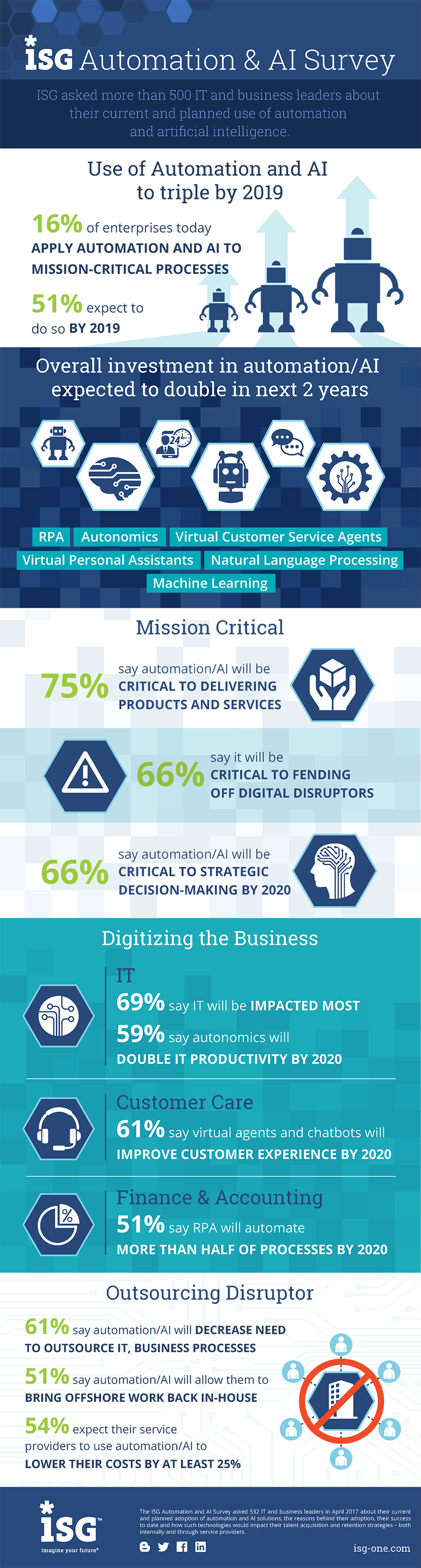 The application of automation and artificial intelligence (AI) to mission-critical business processes will more than triple by 2019, reflecting growing confidence in such technologies. This is among the findings in the latest ISG research in which we asked more than 500 business and IT leaders about their current and future plans for automation and AI. While 16 percent of respondents say they are currently applying automation and AI to one or more mission-critical business processes, more than three times as many (51 percent) say they expect to do so by 2019. This rapid increase in adoption suggests IT and business leaders are becoming more confident that current proof-of-concept and pilot projects will move into production in the next 24 months.